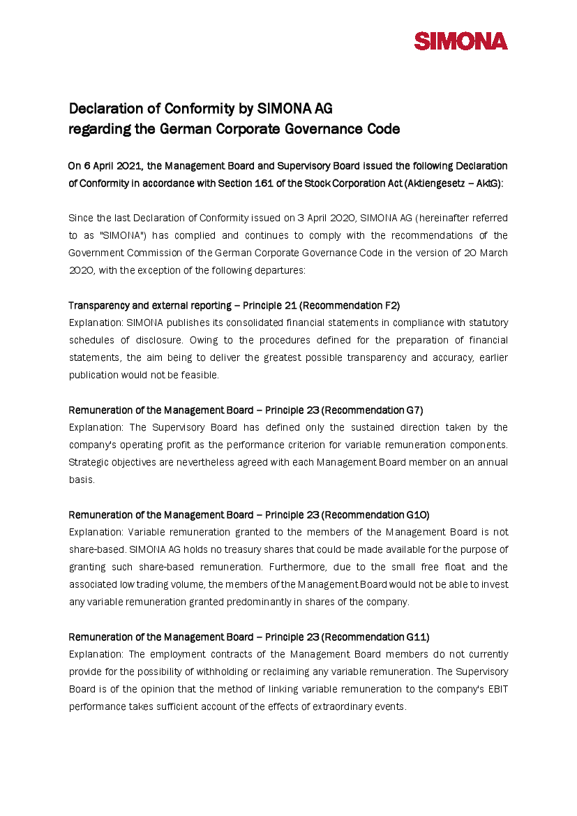 Entsprechenserklärung 06.04.2021 der SIMONA AG zum Deutschen Corporate Governance Kodex