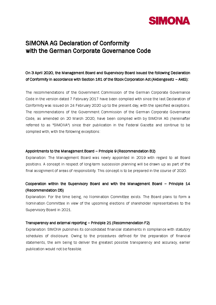 Entsprechenserklärung 03.04.2020 der SIMONA AG zum Deutschen Corporate Governance Kodex
