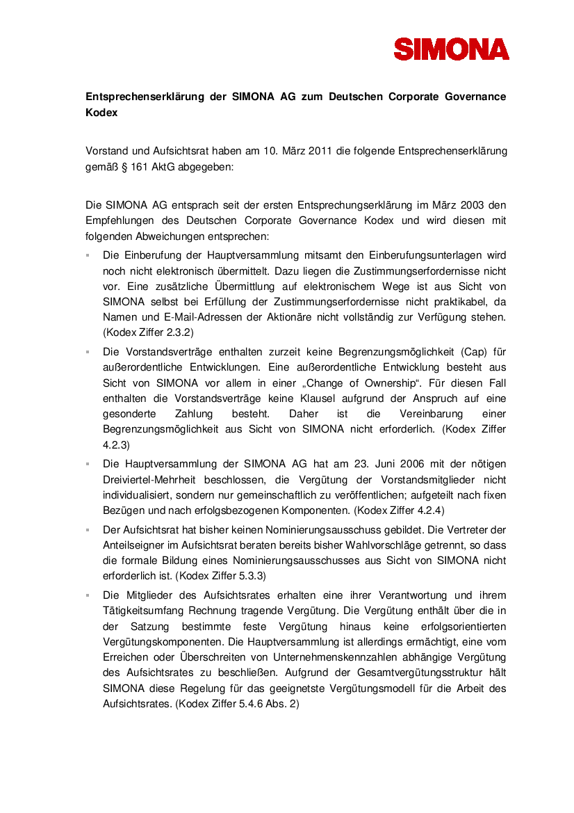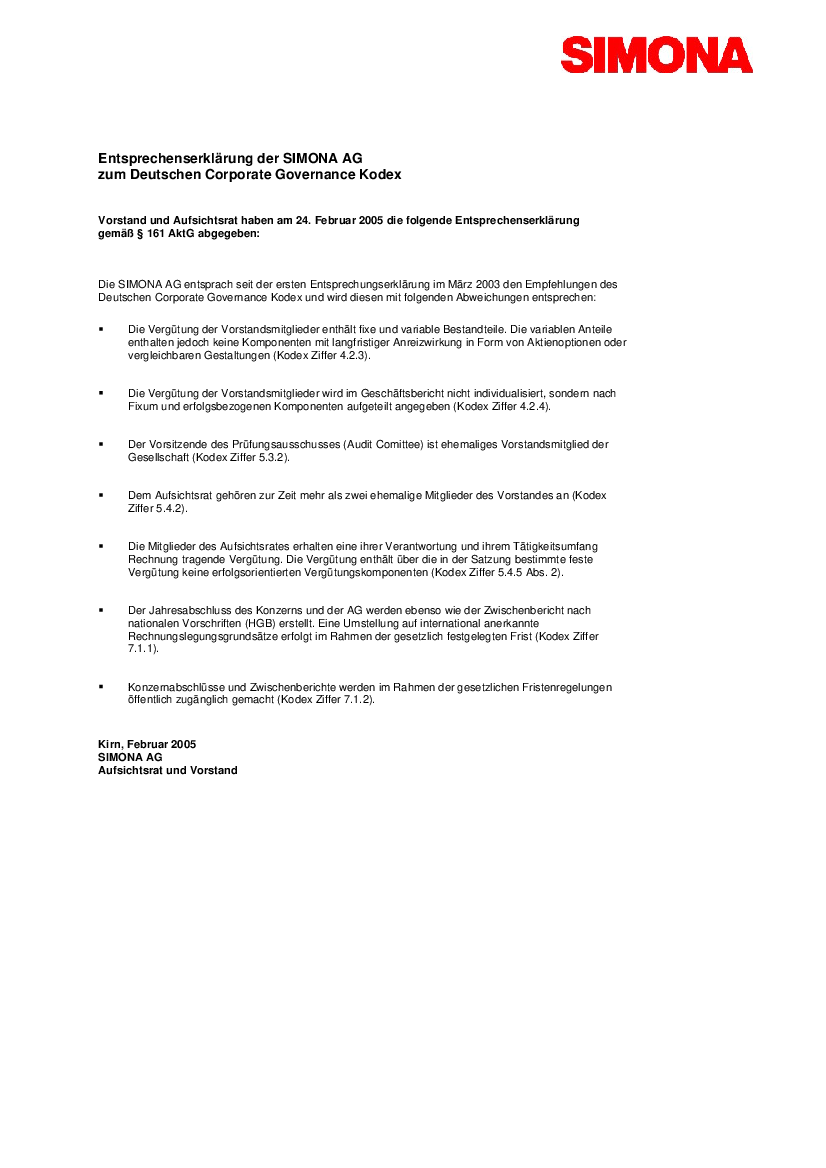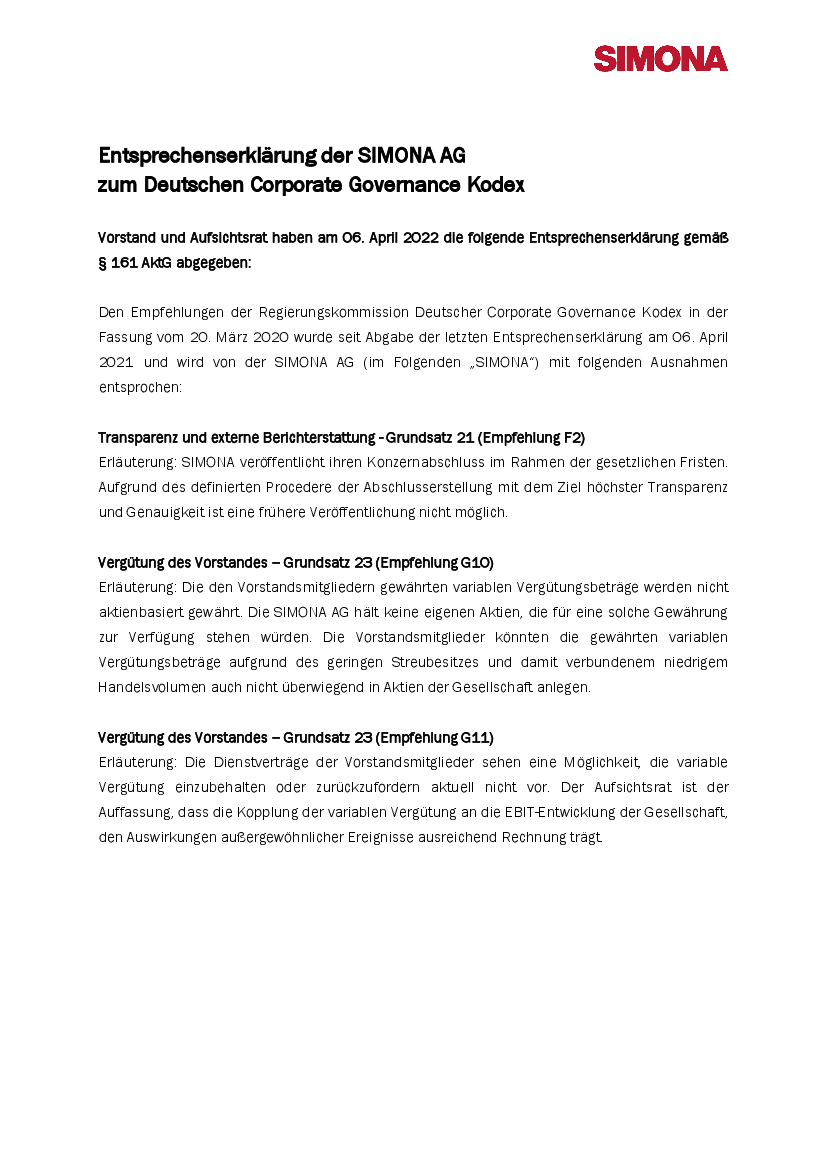 Die SIMONA AG (im Folgenden „SIMONA“) hat seit Abgabe der letzten Entsprechenserklärung am 05. April 2024 den Empfehlungen der Regierungskommission Deutscher Corporate Governance Kodex in der Fassung vom 28. April 2022 mit den folgenden Ausnahmen entsprochen und wird diesen Empfehlungen mit den folgenden Ausnahmen auch künftig entsprechen:
