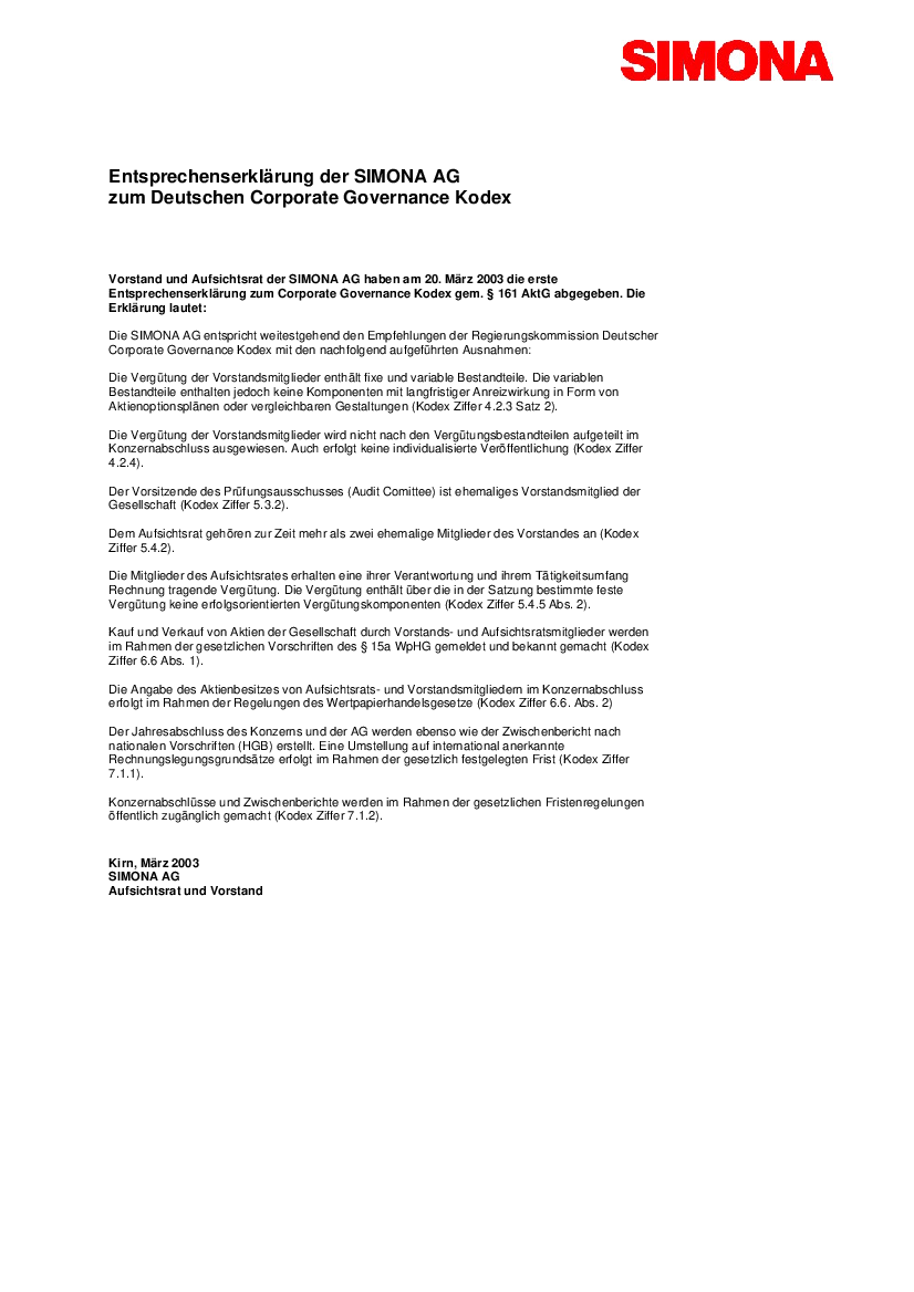 Entsprechenserklärung 2003 der SIMONA AG zum Deutschen Corporate Governance Kodex