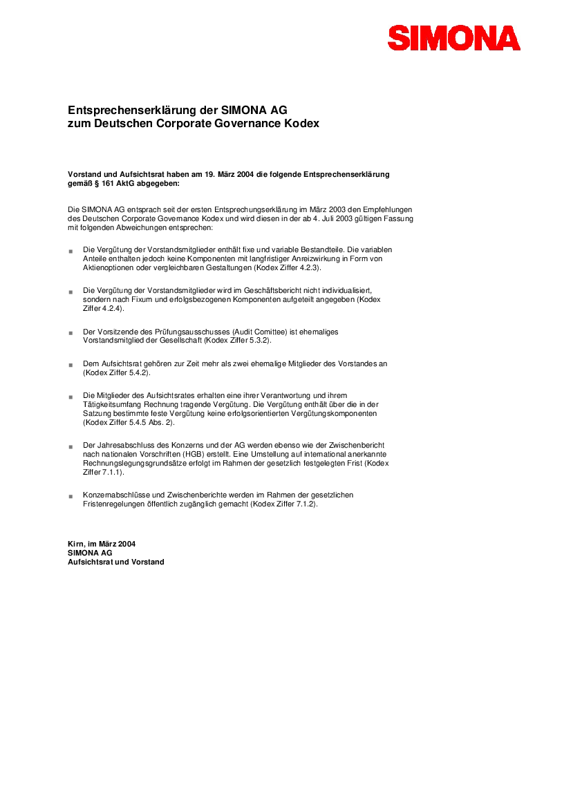 Entsprechenserklärung 2004 der SIMONA AG zum Deutschen Corporate Governance Kodex