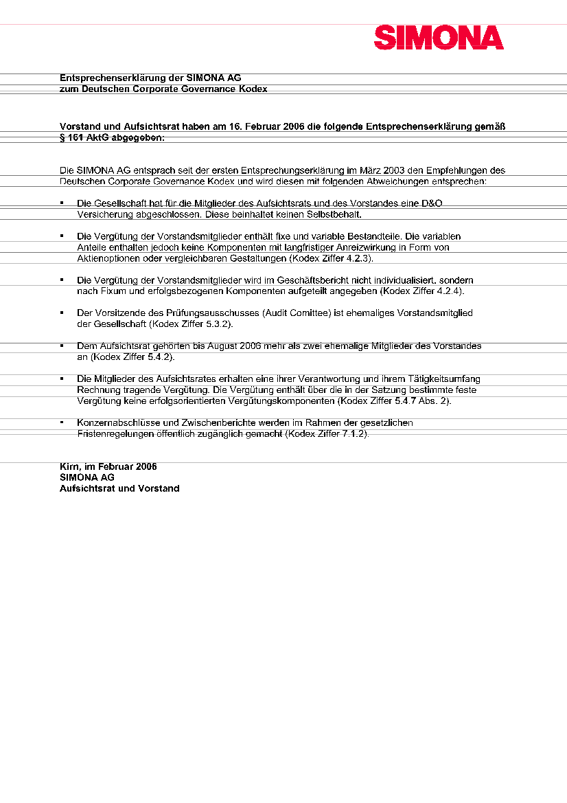 Entsprechenserklärung 2006 der SIMONA AG zum Deutschen Corporate Governance Kodex