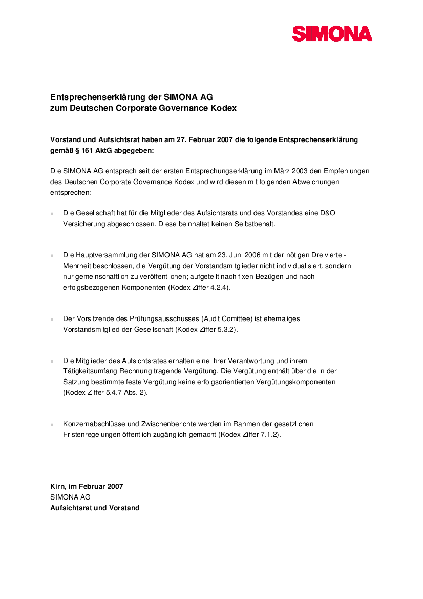 Entsprechenserklärung 2007 der SIMONA AG zum Deutschen Corporate Governance Kodex