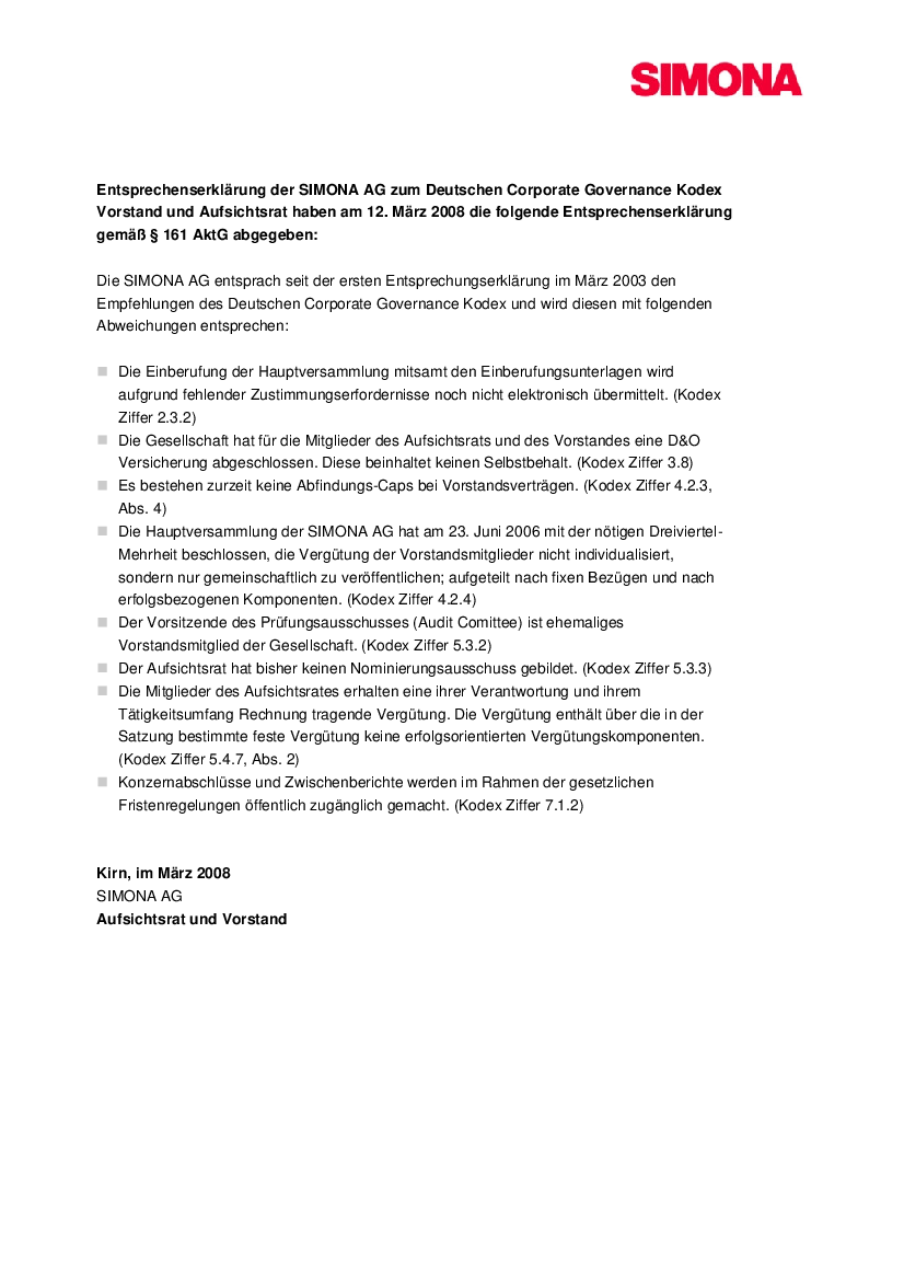 Entsprechenserklärung 2008 der SIMONA AG zum Deutschen Corporate Governance Kodex
