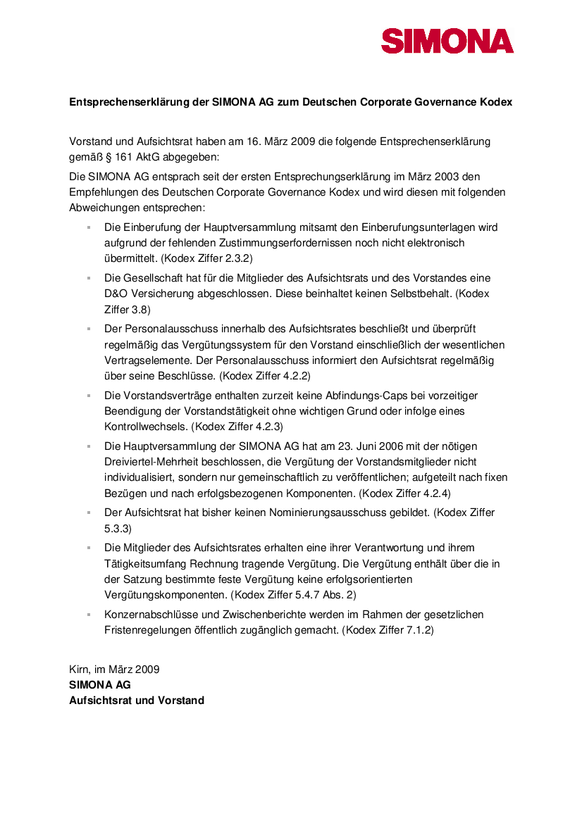 Entsprechenserklärung 2009 der SIMONA AG zum Deutschen Corporate Governance Kodex