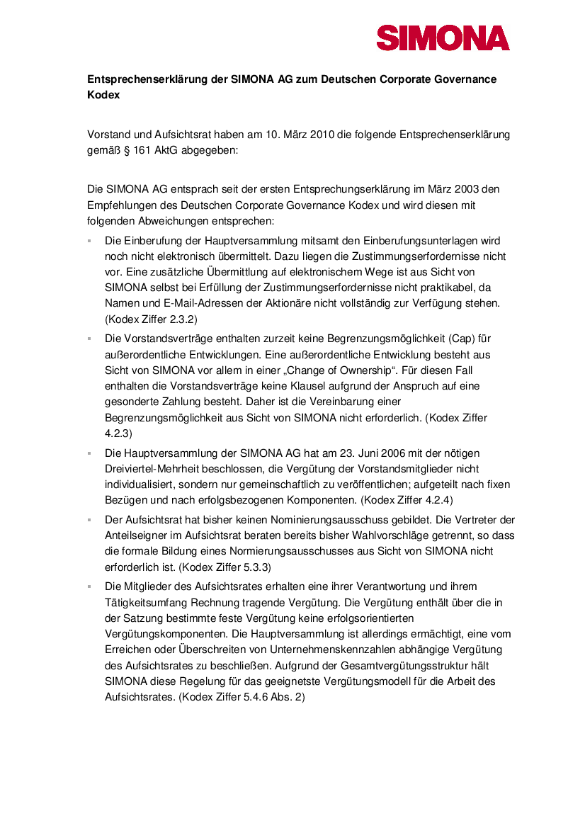 Entsprechenserklärung 2010 der SIMONA AG zum Deutschen Corporate Governance Kodex