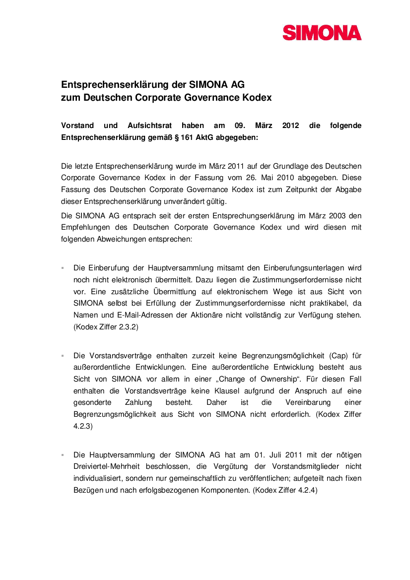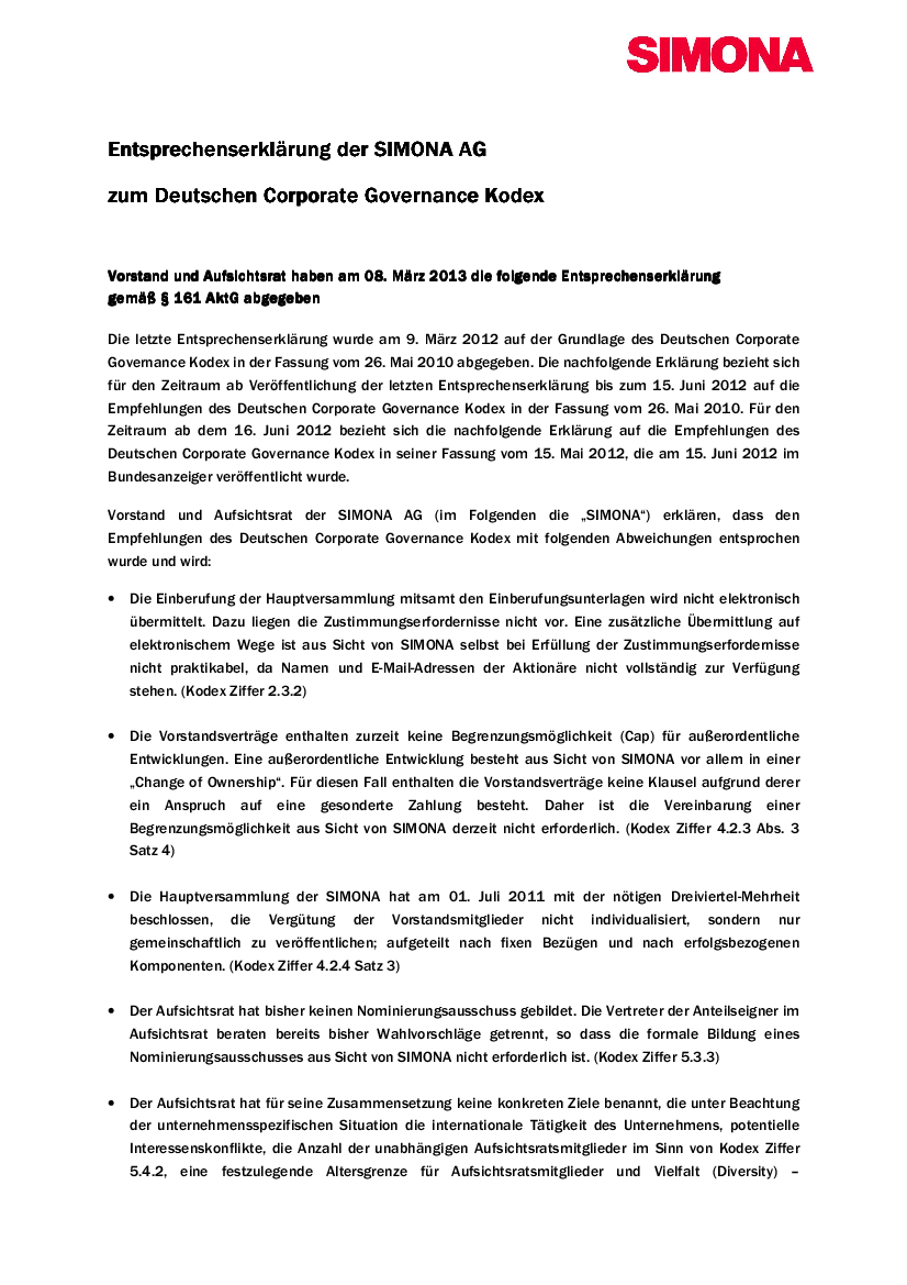 Entsprechenserklärung 2012 der SIMONA AG zum Deutschen Corporate Governance Kodex