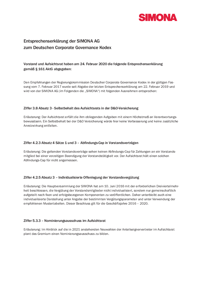 Entsprechenserklärung 24.02.2020 der SIMONA AG zum Deutschen Corporate Governance Kodex