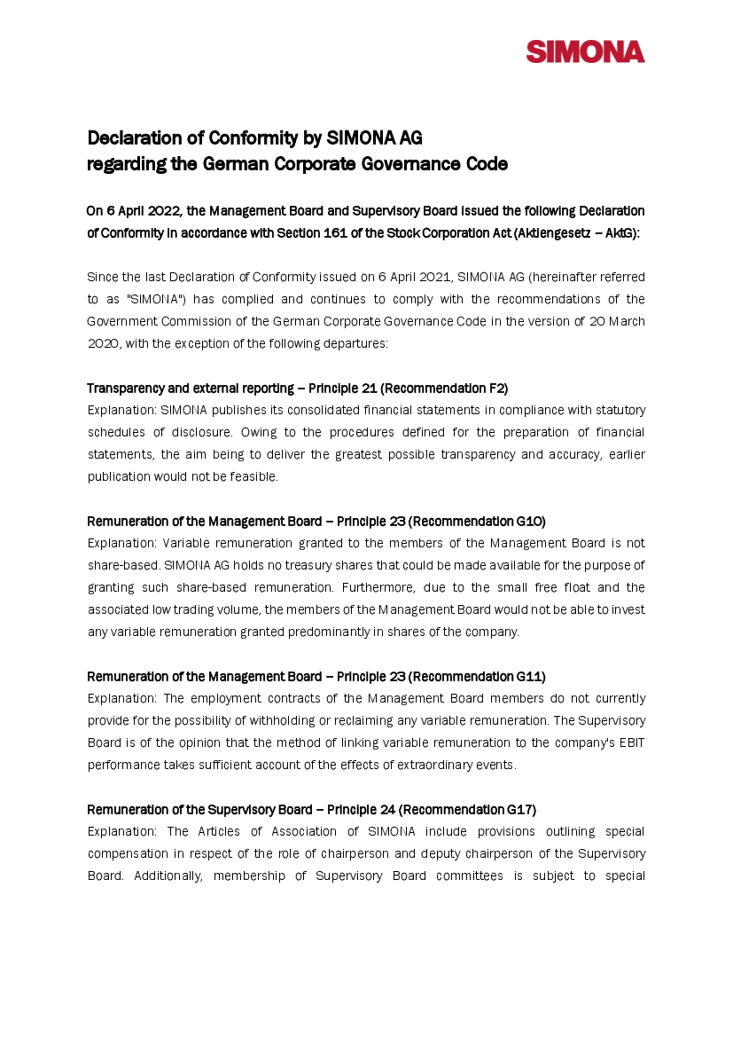 Since issuing its last Declaration of Conformity on April 5, 2024, SIMONA AG (hereinafter referred to as "SIMONA") has complied with the recommendations of the Government Commission on the German Corporate Governance Code as amended on April 28, 2022, with the following exceptions, and will continue to comply with these recommendations in future with the following exceptions: