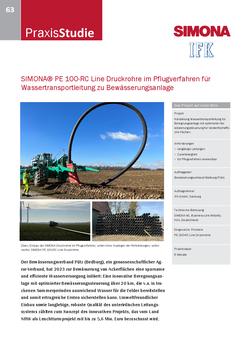 SIMONA bietet qualitativ hochwertige Rohrleitungssysteme für die sichere und verlustfreie Versorgung mit Trinkwasser. Ob für die Wasserfassung, Wasseraufbereitung, Hochbehälterauskleidung oder Trinkwasserversorgung, ob in offener oder grabenloser Verlegung – die bei SIMONA verwendeten Materialien lassen sich optimal auf den jeweiligen Einsatzbereich abstimmen und sind auf höchste Effizienz und Belastbarkeit in allen Einbausituationen ausgelegt.