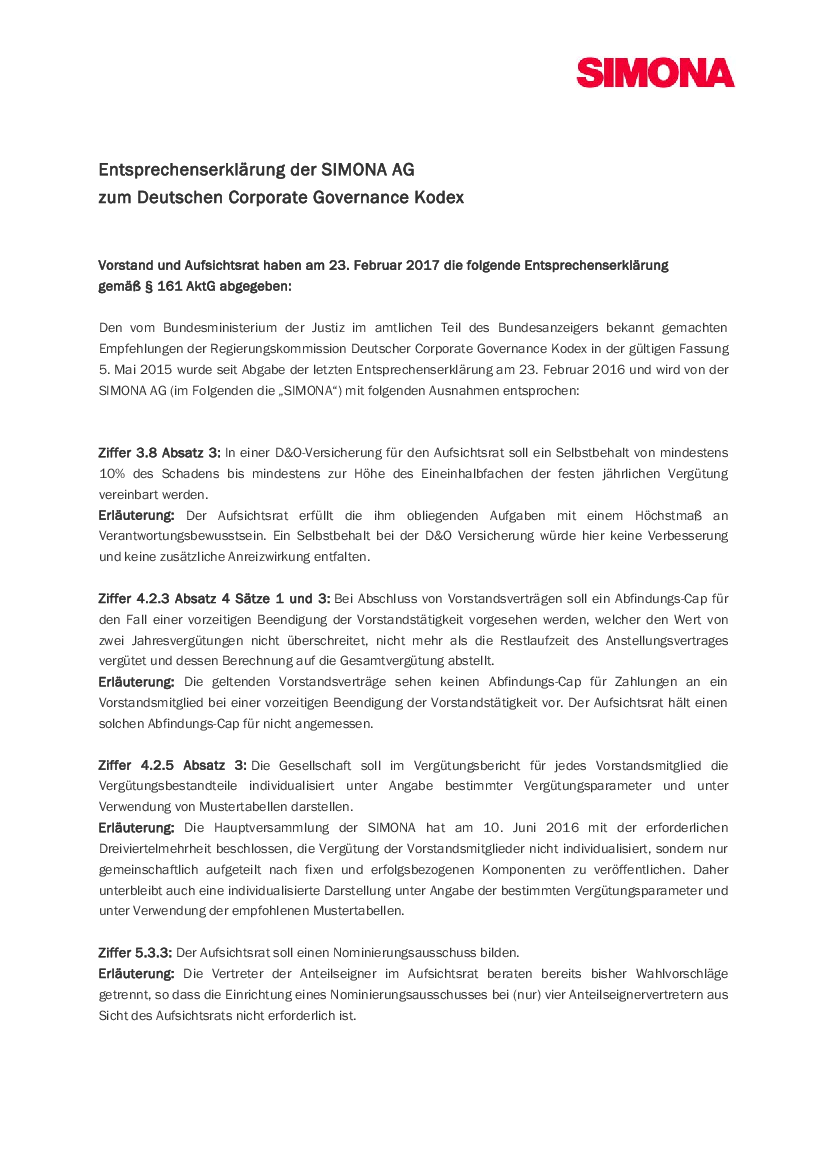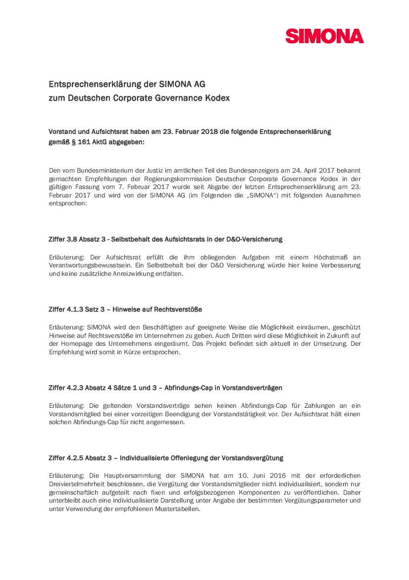 Entsprechenserklärung 2009 der SIMONA AG zum Deutschen Corporate Governance Kodex