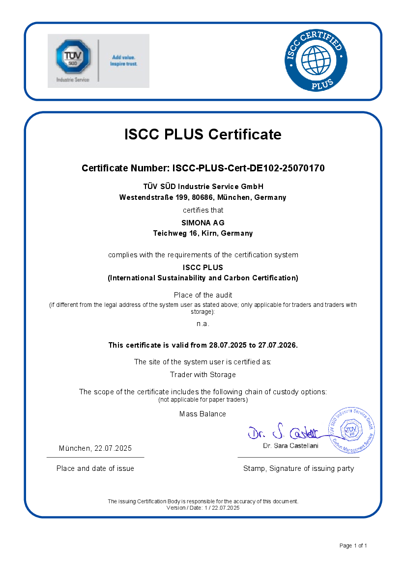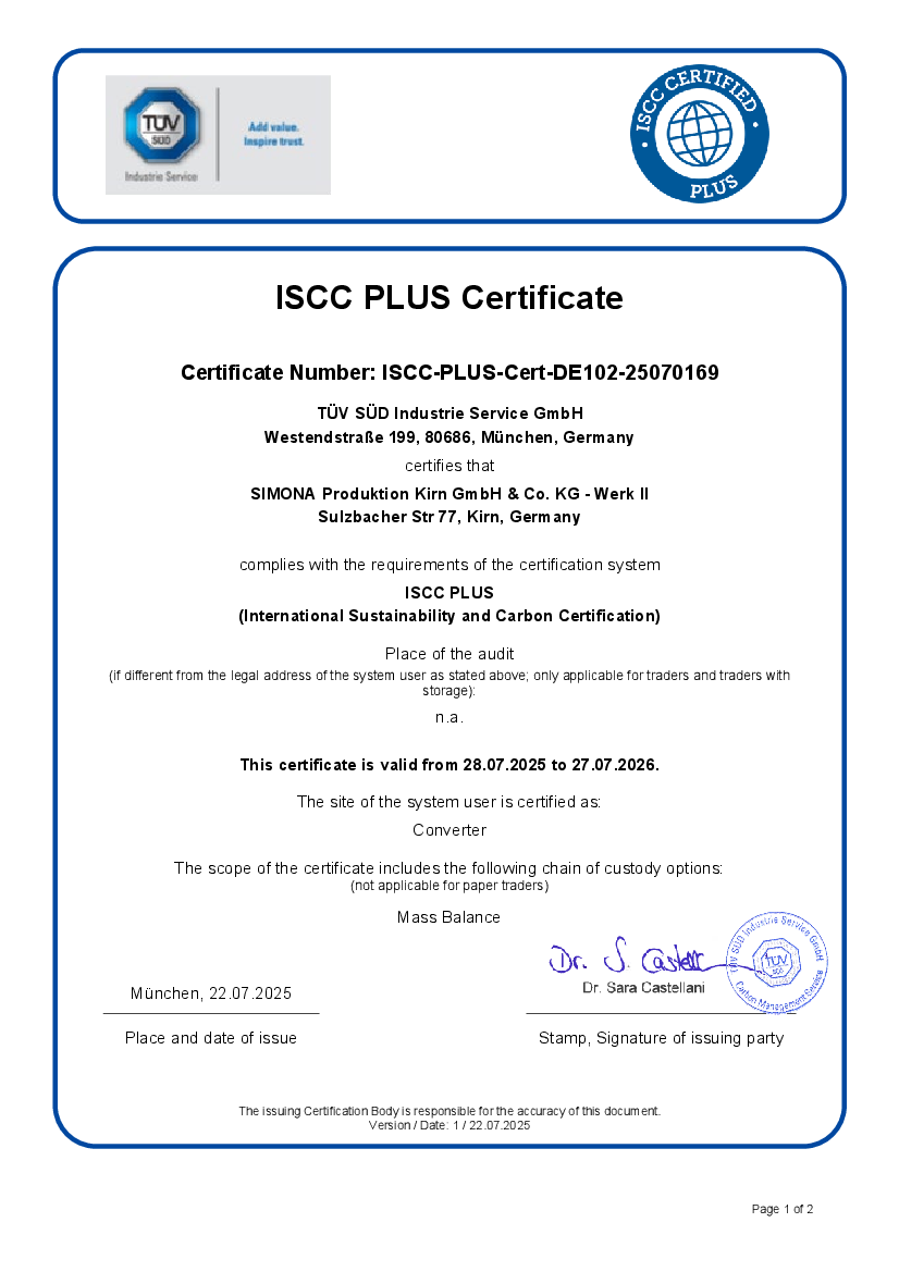 ISCC PLUS Certificate Simona Produktion Kirn Broschüren