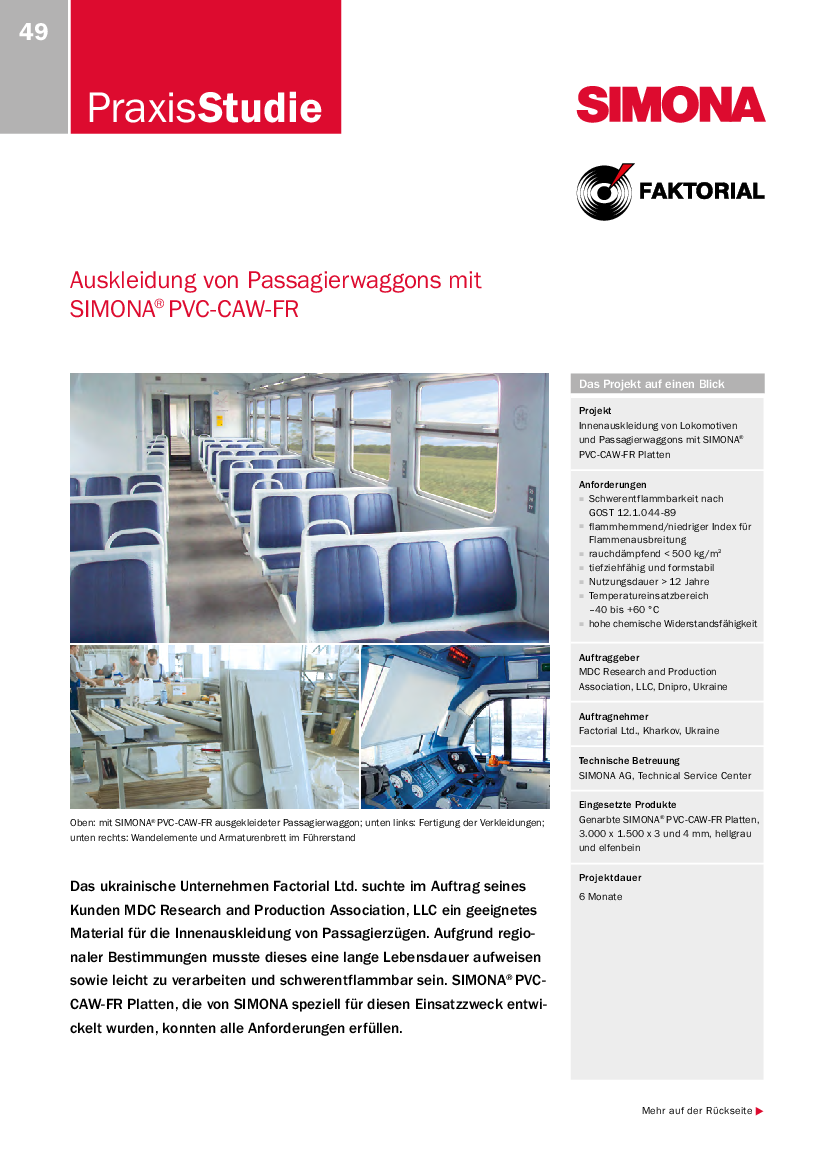 Mit unserer SIMORAIL-Familie haben wir eine Reihe von high-performance Kunststoffen entwickelt, die ein Höchstmaß an Sicherheit, Gewichtsersparnis und Langlebigkeit im Innenraum von Zügen bietet. SIMORAIL erfüllt die Anforderungen aller wichtigen globalen Industrienormen, einschließlich EN 45545 und NFPA 130, und bietet damit vielseitige Anwendungsmöglichkeiten.