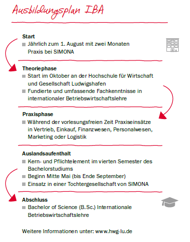Der duale Studiengang verbindet auf einzigartige Weise Theorie, Praxis und Internationalität. In der Praxis werden die Abläufe und Tätigkeiten in den kaufmännischen Abteilungen der SIMONA AG in Kirn erlernt. Wir bieten in den Praxisphasen abwechslungsreiche Aufgaben und eine direkte Einbindung in das Tagesgeschäft, um das erlangte Wissen anwenden zu können. Die Theorie wird an der Hochschule für Wirtschaft und Gesellschaft Ludwigshafen vermittelt. Die Internationalität ist durch ein Auslandssemester in einer unserer Tochtergesellschaften gegeben.