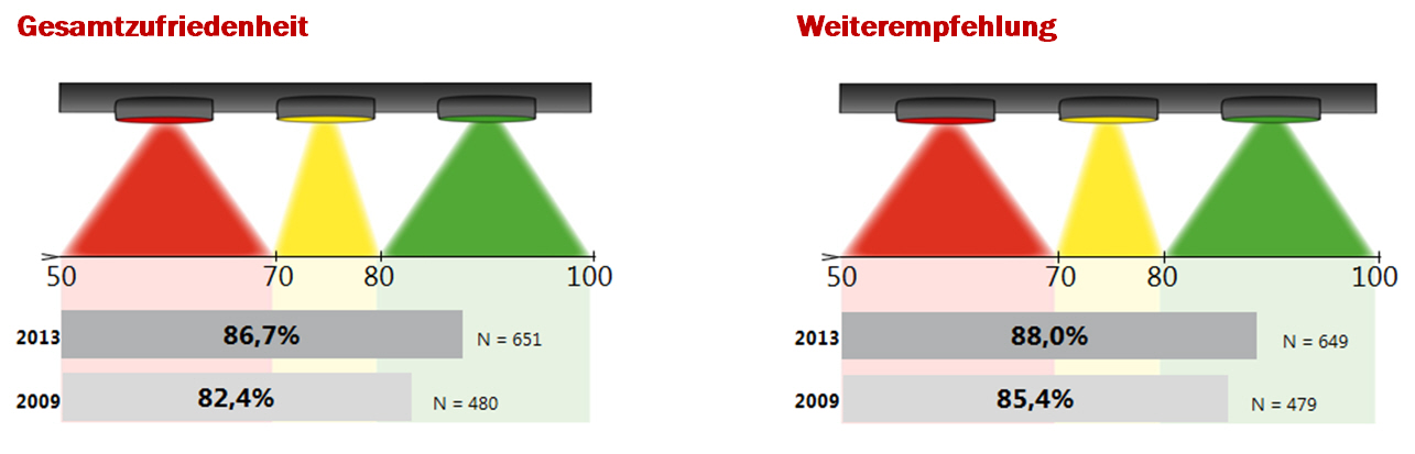 In Deutschland konnten wir eine Gesamtzufriedenheit von 86,2 % (2009: 84,0 %) und eine Weiterempfehlungsquote von 88,2 % (2009: 86,9 %) erreichen.