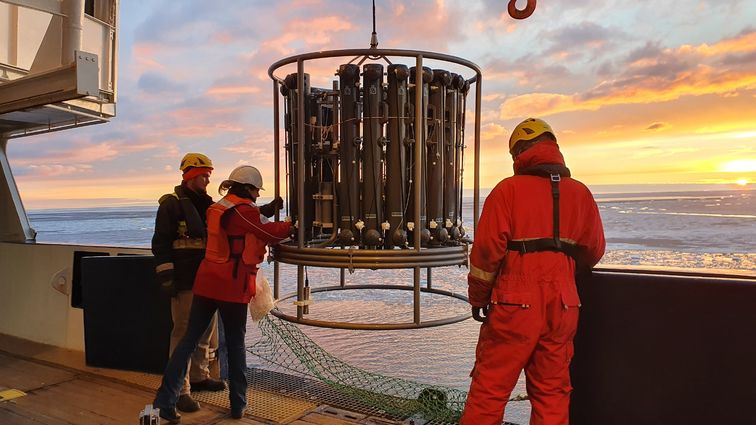 CTD-Kranzwasserschöpfer zur Meerwasser-Probennahme (Foto ©Alfred-Wegener-Institut / Susann Henkel)