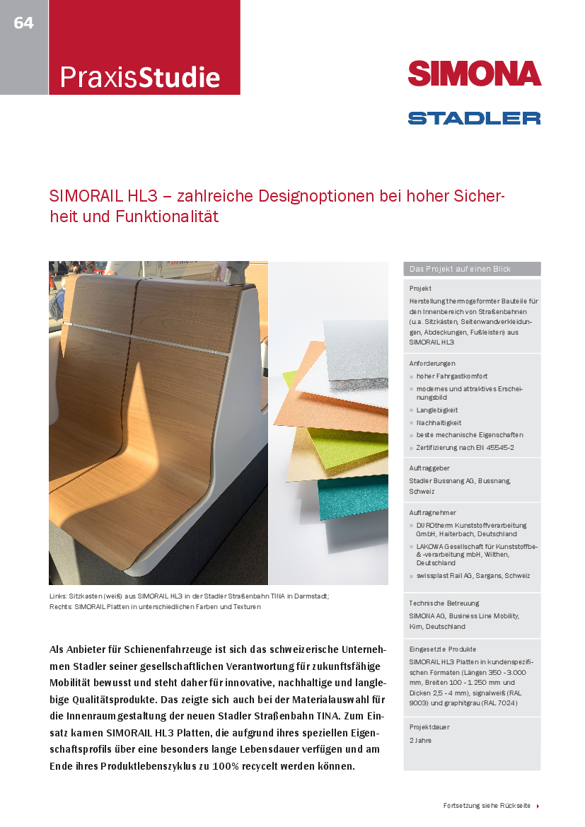 Die hohe Schlagzähigkeit und Formstabilität gepaart mit besten Thermoformeigenschaften ermöglichen es, die unterschiedlichsten Bauteile, wie z.B. Sitzkästen, Seitenwandverkleidungen, Abdeckungen oder Fußleisten, langlebig zu realisieren. Im Vergleich zu Materialien wie HPL oder GFK ist SIMORAIL HL3 vollständig recyclebar und punktet vor allem auch bei der Optik. Die Platten lassen sich in nahezu allen Farben und in verschiedenen Texturen produzieren und bieten als durchgefärbtes Material klare Vorteile hinsichtlich der Sichtbarkeit von Kratzern - ganz ohne aufwendige Bearbeitung mit Lack.
